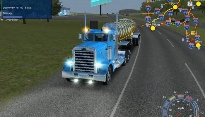 В дорожной модели транспорт реагирует на нагрузку, вес прицепа и состояние покрытия. Тормозной путь удлиняется при высокой скорости и полной загрузке, при резком повороте тяжелый прицеп может раскачать тягач. Во время движения игрок контролирует расход топлива, состояние двигателя, коробки передач и шин. При столкновениях кузов получает визуальные повреждения, а параметры машины ухудшаются, что вынуждает заезжать в сервис и тратить заработанные деньги на ремонт. На длинных дистанциях полезно планировать маршрут с учетом заправок и мест для отдыха, иначе водитель начинает хуже управлять и чаще нарушать правила.