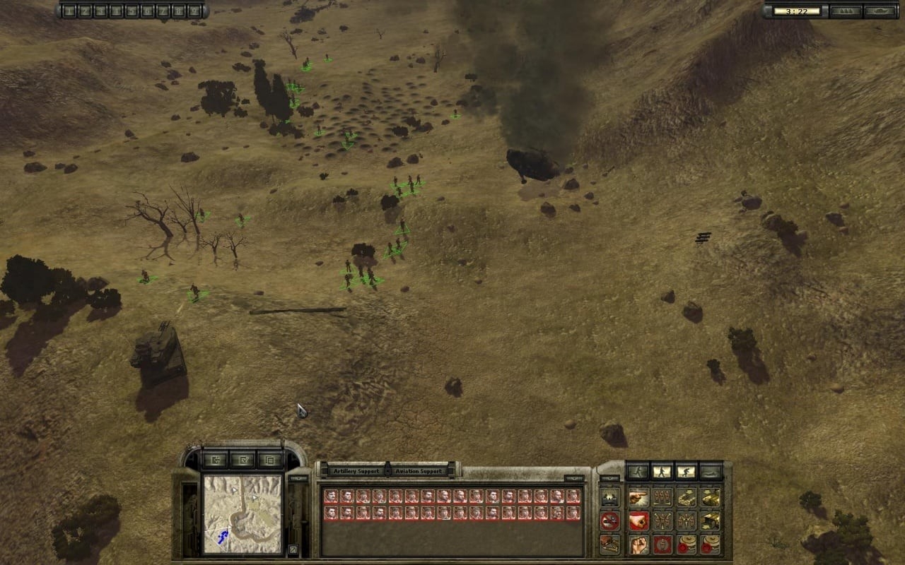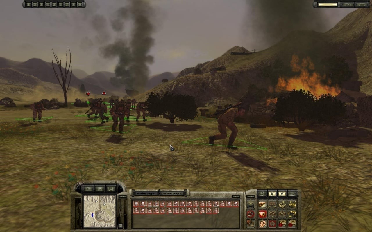 На отдельных этапах техника используется как основной инструмент продвижения - БМП и БТР везут десант, подавляют огневые точки и прикрывают высадку. Повреждения затрагивают отдельные модули: при попадании в гусеницу БМП останавливается, но продолжает стрелять, а пробитый борт с детонацией боекомплекта полностью выводит машину и создает угрозу окружающей пехоте. Вертолеты участвуют как средство высадки и огневой поддержки, но при сильном огне с земли могут получить критические повреждения и покинуть район, лишая игрока воздушного прикрытия. На марше колонна уязвима на узких участках, поэтому приходится заранее выдвигать разведку и организовывать перекрестный огонь.